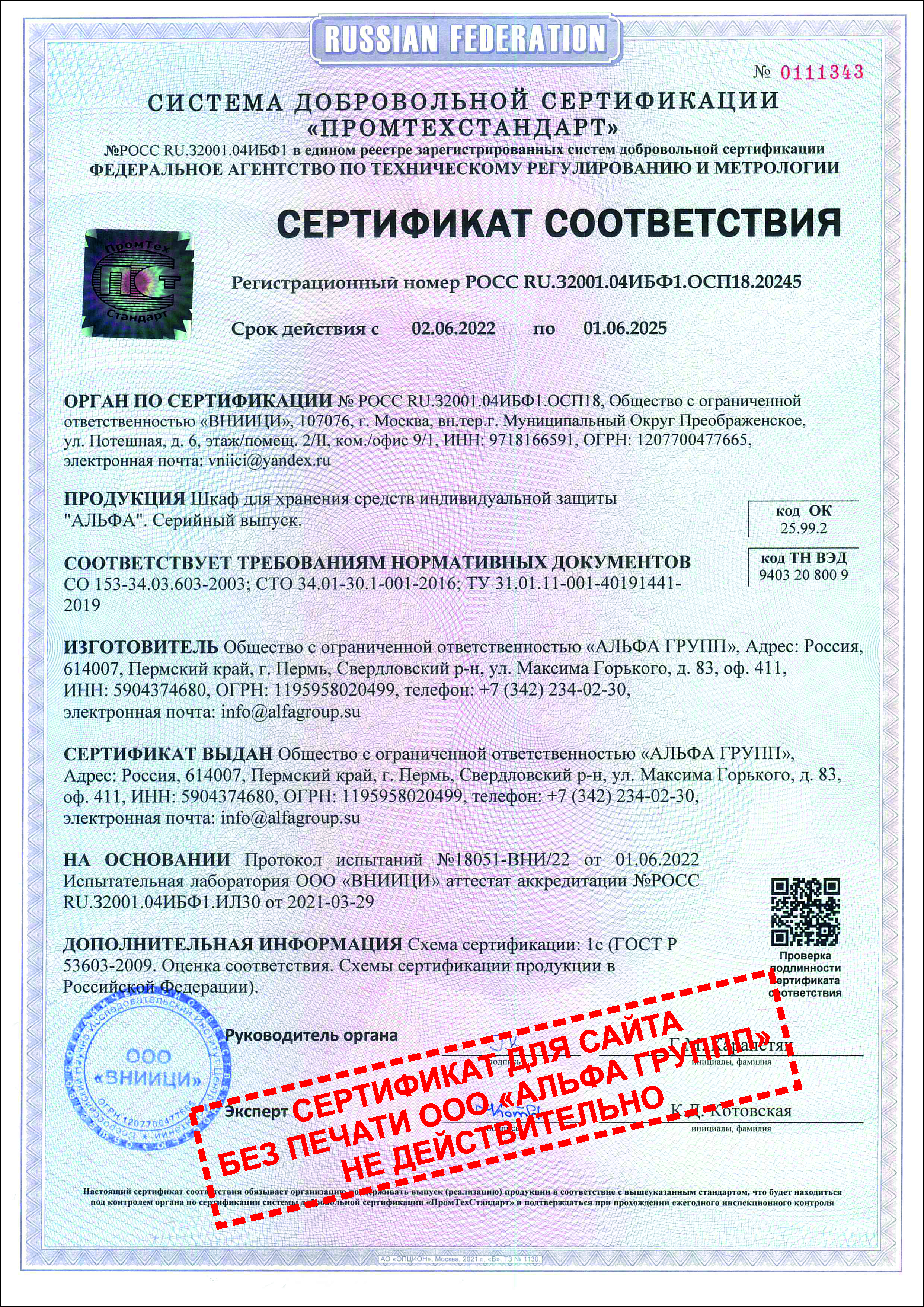 Сертификат ПОЖАРНОЙ безопасности на шкаф АЛЬФА